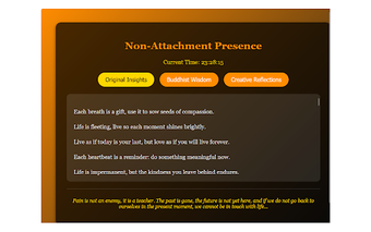 وجود عدم التعلق هو إضافة لمتصفح كروم تقدم مجموعة من 100 اقتباس عن الوعي، مصنفة إلى رؤى أصلية، وحكمة بوذية، وتأملات إبداعية. تهدف هذه الأداة إلى تعزيز وعي المستخدم ووجوده، مقدمة واجهة مريحة بصريًا مع موضوع تدرج لوني مهدئ باللون البرتقالي والأسود. يمكن للمستخدمين التنقل بسهولة بين الفئات باستخدام أزرار مخصصة، مما يسمح بتجربة مركزة أثناء التأمل في الاقتباسات المعروضة.